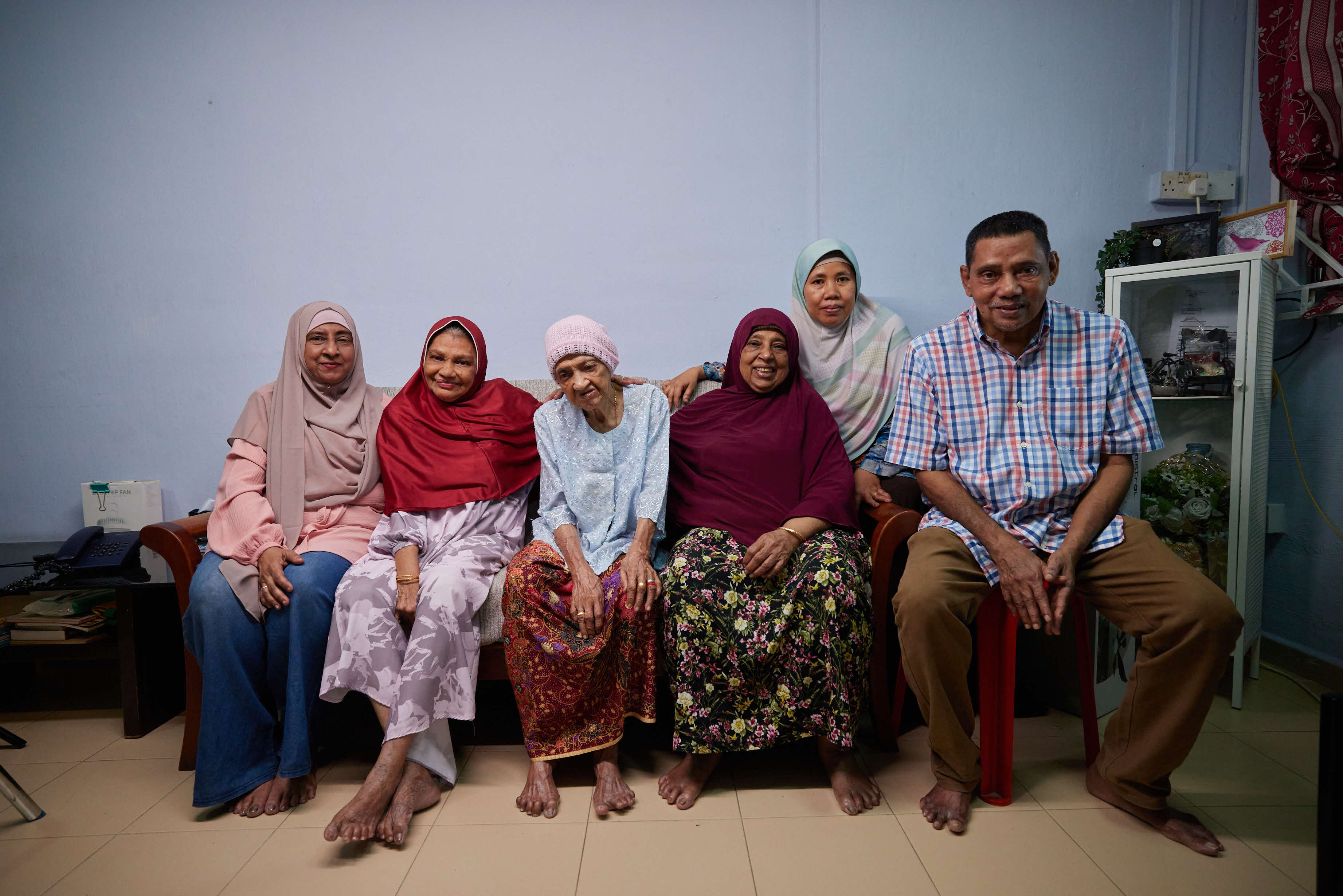 From left: Jamila, her aunt Alimah, her grandmother Mdm Peer, her mum Atika, their family’s domestic helper Masnuah and her uncle Abdul Seram at Seram’s flat